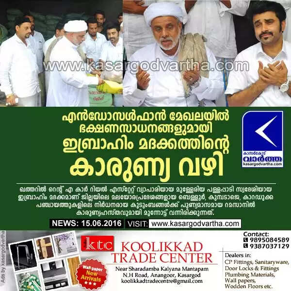 ഖത്തറില് റെന്റ് എ കാര് റിയല് എസ്റ്റേറ്റ് വ്യാപാരിയായ മുള്ളേരിയ പള്ളപ്പാടി സ്വദേശിയായ ഇബ്രാഹിം മദക്കമാണ് ജില്ലയിലെ മലയോരപ്രദേശങ്ങളായ ബെള്ളൂര്, കുമ്പടാജെ, കാറഡുക്ക പഞ്ചായത്തുകളിലെ നിര്ധനരായ കുടുംബങ്ങള്ക്ക് പുണ്യമാസമായ റമസാനില് കാരുണ്യഹസ്തവുമായി മുന്നോട്ട് വന്നിരിക്കുന്നത്. തുടര്ച്ചയായി ഏഴാം വര്ഷമാണ് ഇദ്ദേഹം ഇത്തരം കാരുണ്യപ്രവര്ത്തനം നടത്തുന്നത്.