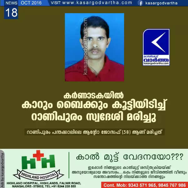 Keywords : Karnataka, Accident, Death, Injured, Bike, Car, Ranipuram, Panathadi, Kanhangad, Kasaragod, Anto Joseph.