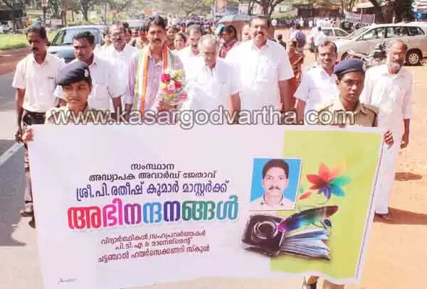സംസ്ഥാന അധ്യാപക അവാര്ഡ് ജേതാവ് പി. രതീഷ് കുമാര് മാസറ്റര്ക്ക് ചട്ടഞ്ചാല് ഹയര്സെക്കന്ഡറി സ്കൂള് വിദ്യാര്ത്ഥികളും സഹപ്രവര്ത്തകരും പി.ടി.എ. കമ്മിറ്റിയും മാനേജ്മെന്റ് കമ്മിറ്റിയും ചേര്ന്ന് നല്കിയ സ്വീകരണം.