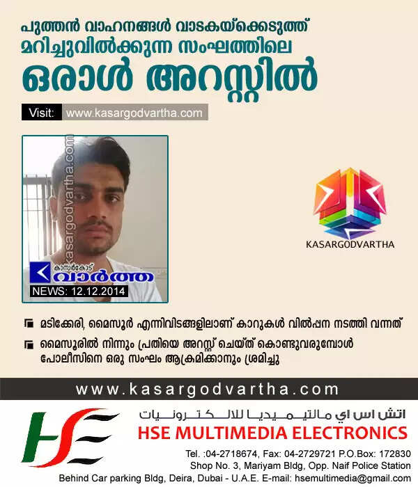 കാസര്‍കോട്: (www.kasargodvartha.com 12.12.2014) പുത്തന്‍ വാഹനങ്ങള്‍ വാടകയ്‌ക്കെടുത്ത് മറിച്ചുവില്‍ക്കുന്ന സംഘത്തിലെ ഒരാളെ പോലീസ് അറസ്റ്റ് ചെയ്തു. മൈസൂര്‍ സെക്കന്റ് ക്രോസ് രാജീവ് നഗറിലെ നയാസ് ഷെരീഫ് (25) ആണ് അറസ്റ്റിലായത്.