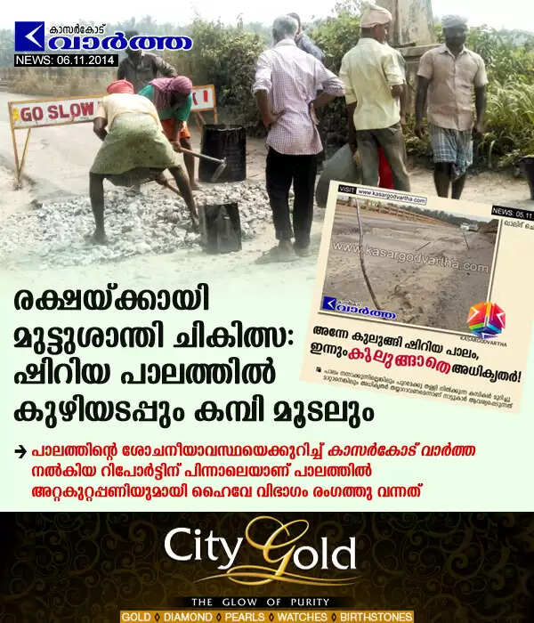 രക്ഷയ്ക്കായി മുട്ടുശാന്തി ചികിത്സ: ഷിറിയ പാലത്തില് കുഴിയടപ്പും കമ്പി മൂടലും