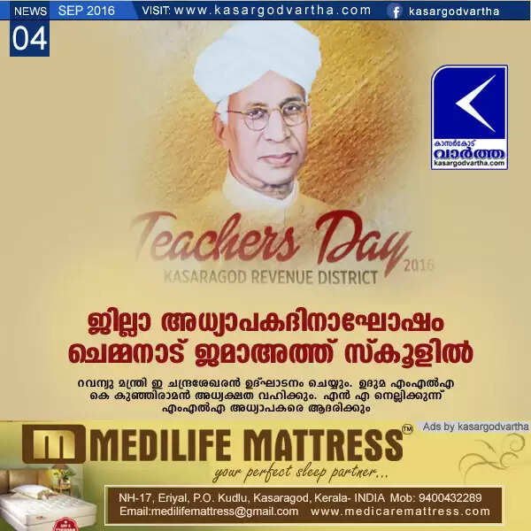 കാസര്‍കോട്: (www.kasargodvartha.com 04.09.2016) കാസര്‍കോട് റവന്യു ജില്ലാ അധ്യാപകദിനാഘോഷം തിങ്കളാഴ്ച്ച ചെമ്മനാട് ജമാഅത്ത് ഹയര്‍ സെക്കന്‍ഡറി സ്‌കൂളില്‍ നടക്കും. 9.30 ന് പരിപാടി ആരംഭിക്കും. റവന്യു മന്ത്രി ഇ ചന്ദ്രശേഖരന്‍ ഉദ്ഘാടനം ചെയ്യും. ഉദുമ എംഎല്‍എ കെ കുഞ്ഞിരാമന്‍ അധ്യക്ഷത വഹിക്കും. എന്‍ എ നെല്ലിക്കിന്ന് എംഎല്‍എ അധ്യാപകരെ ആദരിക്കും.