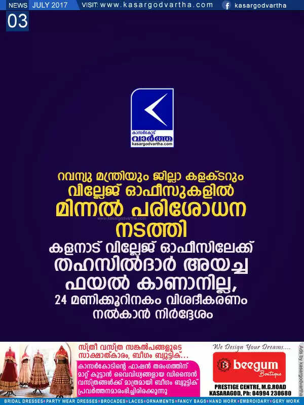Keywords:  Kasaragod, Kerala, news, E.Chandrashekharan, District Collector, Revenue minister and District collector inspected Village offices