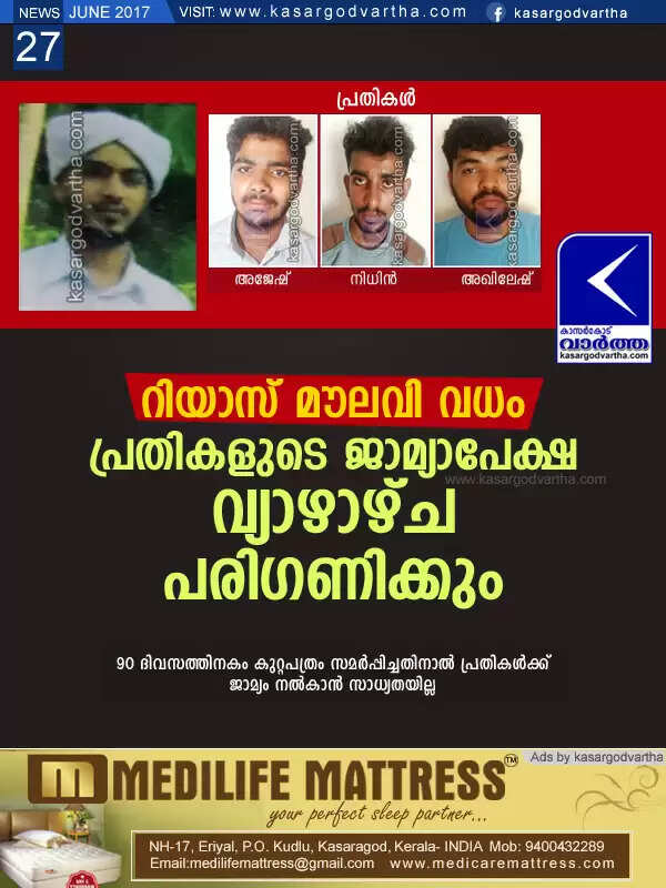 Keywords : Kasaragod, Murder-case, Accuse, Bail, Court, Investigation, Police, Riyas Maulavi Murder Case, Ajesh Appu, Nidhin, Akhilesh, Riyas Maulavi murder case: accused bail plea to hear on 29th.
