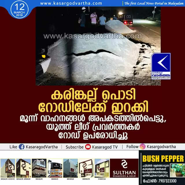 കരിങ്കല്ല് പൊടി റോഡിലേക്ക് ഇറക്കി; മൂന്ന് വാഹനങ്ങള് അപകടത്തില്പെട്ടു, യൂത്ത് ലീഗ് പ്രവര്ത്തകര് റോഡ് ഉപരോധിച്ചു