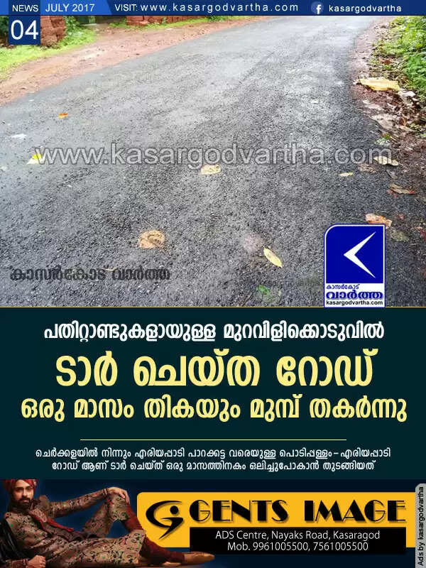 ചെര്ക്കള: (www.kasargodvartha.com 04.07.2017) നാട്ടുകാരുടെ പതിറ്റാണ്ടുകളായുള്ള മുറവിളിക്കൊടുവില് ടാര് ചെയ്ത റോഡ് ഒരു മാസം തികയും മുമ്പ് തകര്ന്നു. ചെര്ക്കളയില് നിന്നും എരിയപ്പാടി പാറക്കട്ട വരെയുള്ള റോഡ് ആണ് ടാര് ചെയ്ത് ഒരു മാസത്തിനകം ഒലിച്ചുപോകാന് തുടങ്ങിയത്. സംഭവം നാട്ടുകാര്ക്കിടയില് പ്രതിഷേധത്തിനിടയാക്കിയിട്ടുണ്ട്.