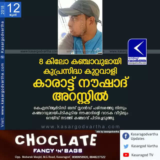 8 കിലോ കഞ്ചാവുമായി കുപ്രസിദ്ധ കുറ്റവാളി കാരാട്ട് നൗഷാദ് അറസ്റ്റില്; കെഎസ്ആര്ടിസി ബസ് സ്റ്റാന്ഡ് പരിസരത്തു നിന്നും കഞ്ചാവുമായി പിടികൂടിയ നൗഷാദിന്റെ വാടക വീട്ടിലും റെയ്ഡ് നടത്തി കഞ്ചാവ് പിടിച്ചെടുത്തു