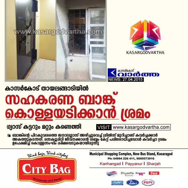 Keywords: Kasaragod, Kerala, Thayalangadi, Bank, Robbery-Attempt, Police, Service Co-operative Bank, Robbery attempt in Bank.