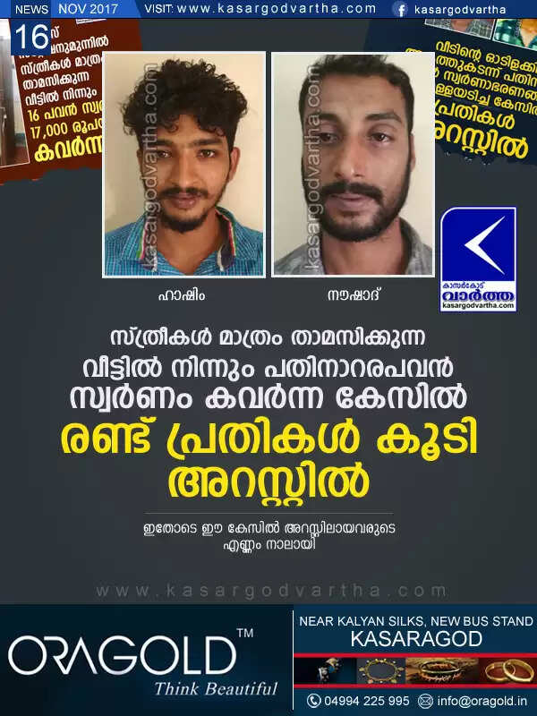 കാഞ്ഞങ്ങാട്: (www.kasargodvartha.com 16.11.2017) സ്ത്രീകള്‍ മാത്രം താമസിക്കുന്ന വീട്ടില്‍ നിന്നും പതിനാറര പവന്‍ സ്വര്‍ണാഭരണങ്ങളും പതിനേഴായിരം രൂപയും കവര്‍ച്ച ചെയ്ത കേസില്‍ പ്രതികളായ രണ്ടുപേരെ കൂടി പോലീസ് അറസ്റ്റ് ചെയ്തു. ഇതോടെ ഈ കേസില്‍ അറസ്റ്റിലായവരുടെ എണ്ണം നാലായി. ഇട്ടമ്മല്‍ ക്വാര്‍ട്ടേഴ്സില്‍ താമസിക്കുന്ന മുഹമ്മദ് നൗഷാദ് കെ എ (20), ഇട്ടമ്മല്‍ വീട്ടില്‍ കെ എം ഹാഷിം (31) എന്നിവരെയാണ് ഹൊസ്ദുര്‍ഗ് എസ്ഐ എ സന്തോഷ്‌കുമാര്‍ അറസ്റ്റുചെയ്തത്.