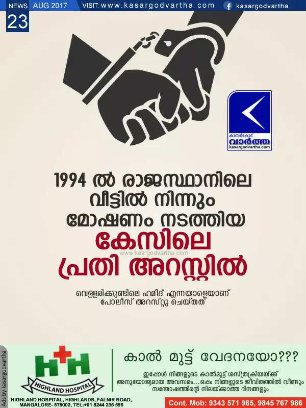 കാഞ്ഞങ്ങാട്: (www.kasargodvartha.com 23.08.2017) 1994 ല് രാജസ്ഥാനിലെ വീട്ടില് നിന്നും മോഷണം നടത്തിയ കേസിലെ പ്രതി അറസ്റ്റിലായി. വെള്ളരിക്കുണ്ടിലെ ഹമീദ് എന്നയാളെയാണ് പോലീസ് അറസ്റ്റു ചെയ്തത്. 23 വര്ഷങ്ങള്ക്കു മുമ്പ് രാജസ്ഥാനിലെ ജോലിക്കു നിന്ന വീട്ടില് നിന്നും പണവും ടിവി ഉള്പെടെയുള്ള ഉപകരണങ്ങളുമായി കടന്നു കളയുകയായിരുന്നു.
