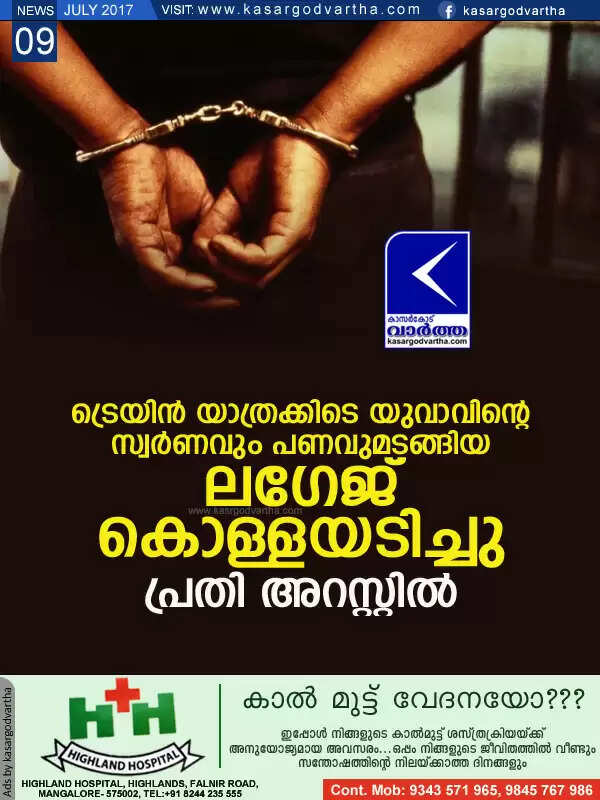 ട്രെയിന്‍ യാത്രക്കിടെ യുവാവിന്റെ സ്വര്‍ണവും പണവുമടങ്ങിയ ലഗേജ് കൊള്ളയടിച്ചു; പ്രതി അറസ്റ്റില്‍
