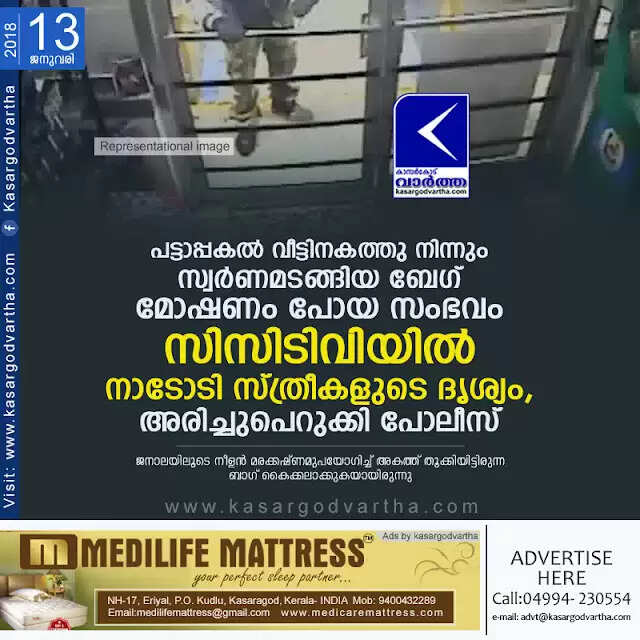 കാഞ്ഞങ്ങാട്:(www.kasargodvartha.com 13.01.2018) പട്ടാപ്പകല്‍ വീട്ടിനകത്തു നിന്നും സ്വര്‍ണമടങ്ങിയ ബേഗ് മോഷണം പോയ സംഭവത്തില്‍ പോലീസ് അന്വേഷണം ഊര്‍ജിതമാക്കി. സിസിടിവി പരിശോധിച്ചപ്പോള്‍ നാടോടി സ്ത്രീയുടെ കൈയ്യില്‍ ബാഗുള്ളതായി കണ്ടെത്തി. ഇതിന്റെ അടിസ്ഥാനത്തില്‍ നാടോടി സ്ത്രീകളെ കണ്ടെത്താന്‍ നാട്ടുകാരും പോലീസും അരിച്ചുപെറുക്കുകയാണ്. മൂന്ന് നാടോടി സ്ത്രീകളാണ് സിസിടിവിയിലുള്ളത്. ഇതില്‍ രണ്ട് നാടോടി സ്ത്രീകളെ നാട്ടുകാരും പോലീസും ചേര്‍ന്ന് കണ്ടെത്തിയെങ്കിലും ബാഗുമായി കടന്നുകളഞ്ഞ സ്ത്രീയെ കണ്ടെത്താന്‍ കഴിഞ്ഞിട്ടില്ല.