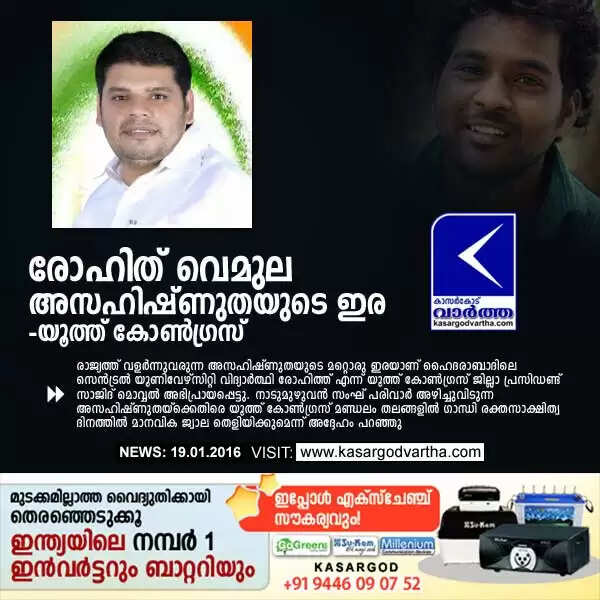 Keywords : Kasaragod, Death, Student, BJP, Youth, President, Sangh Parivar, Rohith, Rohith Vemula: Youth congress statement, Sajid Movvel.