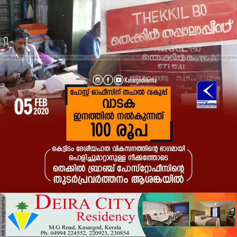 പോസ്റ്റ് ഓഫീസിന് തപാല് വകുപ്പ് വാടക ഇനത്തില് നല്കുന്നത് 100 രൂപ; കെട്ടിടം ദേശീയപാത വികസനത്തിന്റെ ഭാഗമായി പൊളിച്ചുമാറ്റാനുള്ള നീക്കത്തോടെ തെക്കില് ബ്രാഞ്ച് പോസ്റ്റോഫീസിന്റെ തുടര്പ്രവര്ത്തനം ആശങ്കയില്