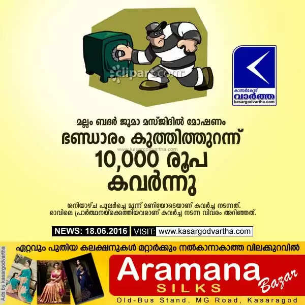 മല്ലം ബദര് ജുമാ മസ്ജിദില് മോഷണം: ഭണ്ഡാരം കുത്തിത്തുറന്ന് 10,000 രൂപ കവര്ന്നു