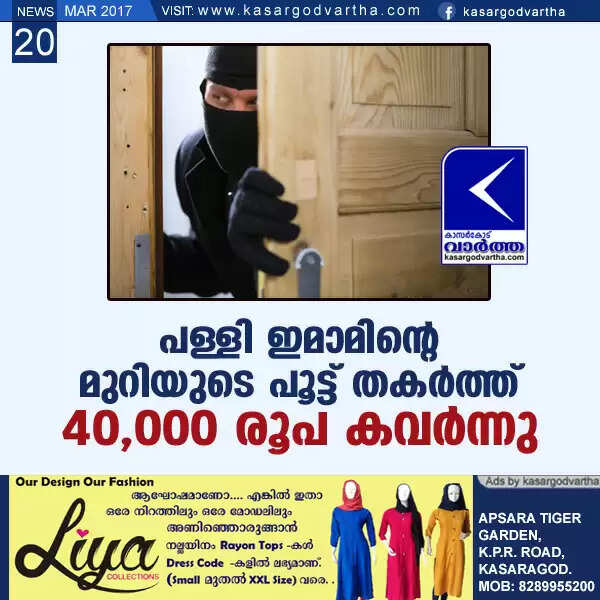 Keywords: Kasaragod, Robbery, Complaint, Police, Case, Investigation, Lock of room, RS 40000 stolen from imam's residence.