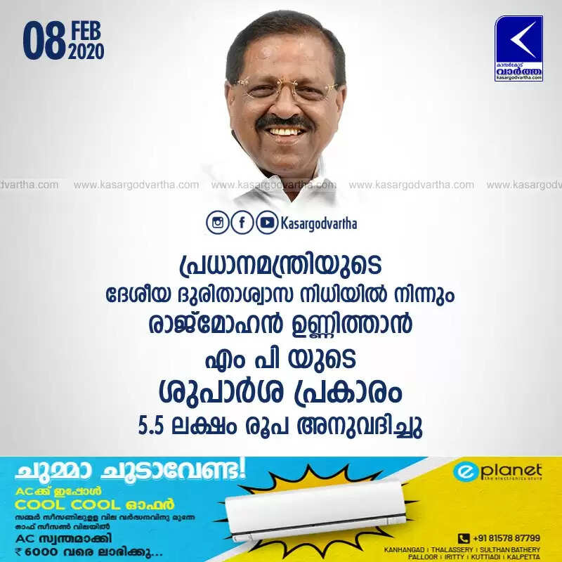 Keywords: Kasaragod, News, Rajmohan Unnithan, MP, Treatment, Prime Minister, Rs 5.5 lakh has been allotted from the Prime Minister's National Relief Fund On the recommendation of Rajmohan Unnithan MP.