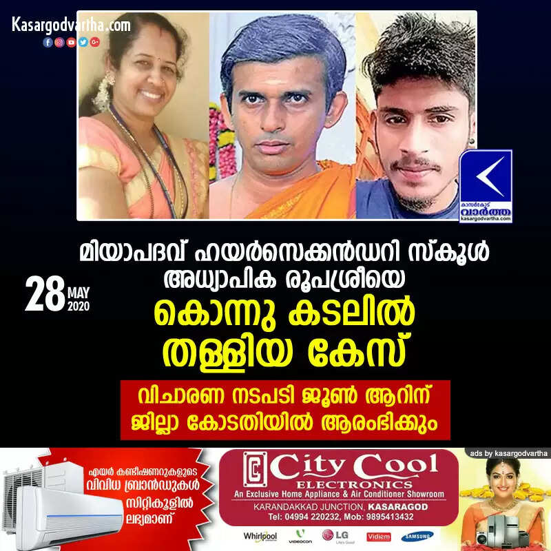 മിയാപദവ് ഹയര്സെക്കന്ഡറി സ്കൂള് അധ്യാപിക രൂപശ്രീയെ കൊന്നു കടലില് തള്ളിയ കേസ്: വിചാരണ നടപടി ജൂണ് ആറിന് ജില്ലാ കോടതിയില് ആരംഭിക്കും