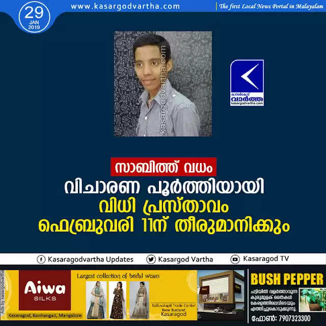 സാബിത്ത് വധം: വിചാരണ പൂര്ത്തിയായി, വിധി പ്രസ്താവം ഫെബ്രുവരി 11ന് തീരുമാനിക്കും