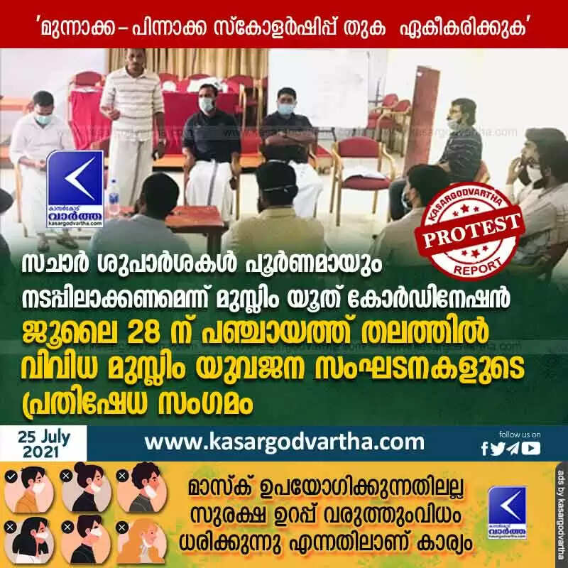 കാസര്കോട്: (www.kasargodvartha.com 25.07.2021) സചാര് കമീഷന് ശുപാര്ശകള് വെള്ളം ചേര്ക്കാതെ പൂര്ണമായും നടപ്പിലാക്കണമെന്ന് മുസ്ലിം യൂത് കോര്ഡിനേഷന് ജില്ലാ കമിറ്റി യോഗം ആവശ്യപ്പെട്ടു. ശുപാര്ശകള് നടപ്പിലാക്കാന് പ്രത്യേക ബോര്ഡ് രൂപീകരിക്കുക, മുന്നാക്ക - പിന്നാക്ക സ്കോളര്ഷിപ്പ് തുക ഏകീകരിക്കുക, സര്കാര് സെര്വീസില് ജനസംഖ്യ ആനുപാതിക പ്രാതിനിധ്യം നല്കുക തുടങ്ങിയ ആവശ്യങ്ങളുന്നയിച്ച് വിവിധ മുസ്ലിം യുവജന സംഘടനകളുടെ നേതൃത്യത്തില് ജൂലൈ 28 ന് പഞ്ചായത്ത് തലത്തില് പ്രതിഷേധ സംഗമം സംഘടിപ്പിക്കും