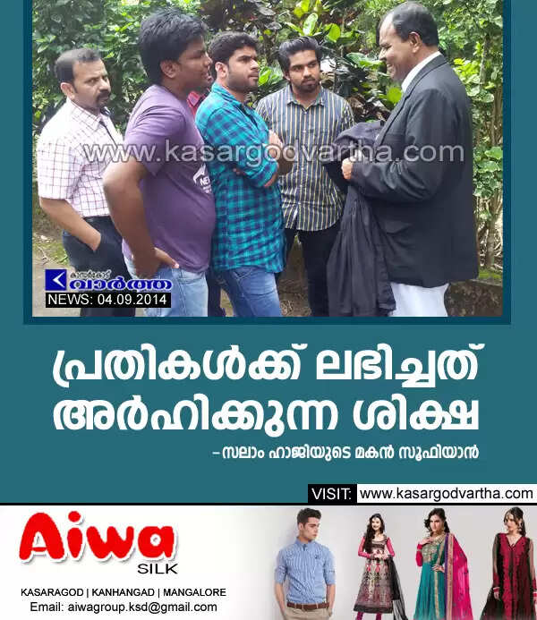 കാസര്കോട്: (www.kasargodvartha.com 04.09.2014) പ്രതികള്ക്ക് ലഭിച്ചത് അര്ഹിക്കുന്ന ശിക്ഷതന്നെയാണെന്ന് കൊല്ലപ്പെട്ട അബ്ദുല് സലാം ഹാജിയുടെ മകന് സൂഫിയാന് കാസര്കോട് വാര്ത്തയോട് പറഞ്ഞു. പ്രതികള്ക്ക് തൂക്കുകയര് ലഭിക്കണമെന്നാണ് ആഗ്രഹിച്ചത്.