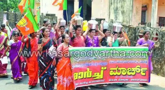 തലയില്‍ കുടവുമേന്തി എം.എല്‍.എ ക്കെതിരെ രൂക്ഷമായ ഭാഷയില്‍ മുദ്രാവാക്യം വിളിച്ചു കൊണ്ടായിരുന്നു വനിതകളുടെ മാര്‍ച്ച്. ബി.ജെ.പി ജില്ലാ ജനറല്‍ സെക്രട്ടറി അഡ്വ. കെ.ശ്രീകാന്ത് ഉദ്ഘാടനം ചെയ്തു. മഹിളാ മോര്‍ച്ച ജില്ലാ പ്രസിഡന്റ് രത്‌നാവതി അദ്ധ്യക്ഷത വഹിച്ചു. പ്രമീള സി.നായിക്, സരോജ ആര്‍ ബല്ലാള്‍, എം.ജനനി, കെ.ബിന്ധു, സന്ധ്യ മല്ല്യ, സി.അനിത, നിര്‍മല എന്നിവര്‍ നേതൃത്വം നല്‍കി. ശ്രീലത ടീച്ചര്‍ സ്വാഗതം പറഞ്ഞു.