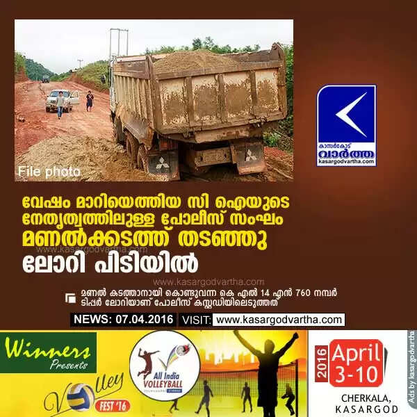 Keywords: Police, Illegal sand, Sand-Lorry, custody, Kumbala, kasaragod, Shiriya, CI Abdul Muneer.