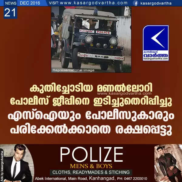 കുതിച്ചോടിയ മണല്ലോറി പോലീസ് ജീപ്പിനെ ഇടിച്ചുതെറിപ്പിച്ചു; എസ്ഐയും പോലീസുകാരും പരിക്കേല്ക്കാതെ രക്ഷപ്പെട്ടു