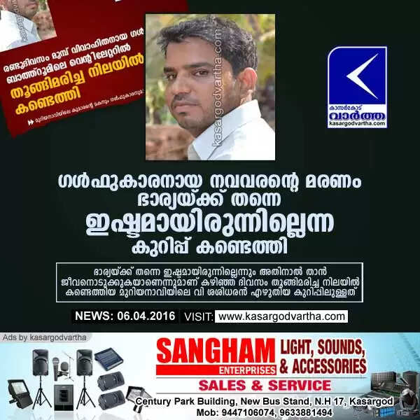 കാഞ്ഞങ്ങാട്: (www.kasargodvartha.com 06.04.2016) രണ്ട് ദിവസം മുമ്പ് വിവാഹിതനായ മുറിയനാവിയിലെ വി ശശിധരന്റെ (32) മരണവുമായി ബന്ധപ്പെട്ട് പോലീസ് അന്വേഷണം ഊര്ജിതമാക്കി. യുവാവ് മരണത്തിന് മുമ്പ് എഴുതിയ കുറിപ്പ് പോലീസ് കണ്ടെത്തി. ഭാര്യയ്ക്ക് തന്നെ ഇഷ്ടമായിരുന്നില്ലെന്നും അതിനാല് താന് ജീവനൊടുക്കുകയാണെന്നുമാണ് കുറിപ്പിലുള്ളത്.