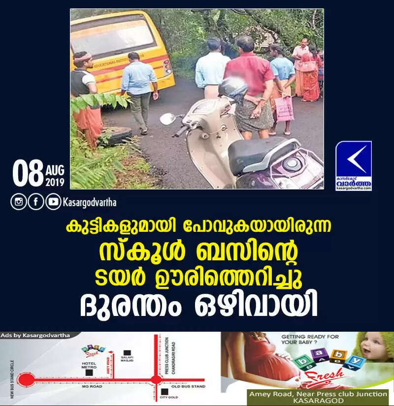 കുട്ടികളുമായി പോവുകയായിരുന്ന സ്കൂള് ബസിന്റെ ടയര് ഊരിത്തെറിച്ചു; ദുരന്തം ഒഴിവായി