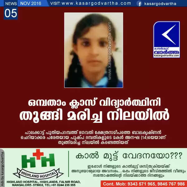 നീലേശ്വരം: (www.kasargodvartha.com 05/11/2016) ഒമ്പതാം ക്ലാസ് വിദ്യാര്ത്ഥിനിയെ തൂങ്ങിമരിച്ച നിലയില് കണ്ടെത്തി. നീലേശ്വരം രാജാസ് എച്ച് എസ് എസ് ഒമ്പതാം ക്ലാസ് വിദ്യാര്ത്ഥിനിയും പാലക്കാട്ട് പുതിയപറമ്പത്ത് ഭഗവതി ക്ഷേത്രസമീപത്തെ ബാലകൃഷ്ണന് ചെറിയാക്കര- പരേതയായ പുഷ്പ ദമ്പതികളുടെ മകള് അനഘ (14)യെയാണ് തൂങ്ങിമരിച്ച നിലയില് കണ്ടെത്തിയത്.