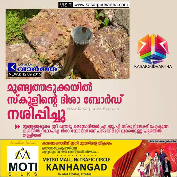 മുണ്ട്യത്തടുക്ക: (www.kasargodvartha.com 12/09/2015) മുണ്ട്യത്തടുക്ക ശ്രീ മഞ്ചയ്യ മെമ്മോറിയല് എ.യു.പി സ്കൂളിലേക്ക് പോകുന്ന വഴിയില് സ്ഥാപിച്ച ദിശാ ബോര്ഡ് സാമൂഹ്യ വിരുദ്ധര് നശിപ്പിച്ചു. ഇരുമ്പ് പൈപ്പില് വെല്ഡ് ചെയ്തു വെച്ചിരുന്ന ബോര്ഡാണ് പിഴുത് മാറ്റി ദുരെയുള്ള പുഴയില് തള്ളിയത്.