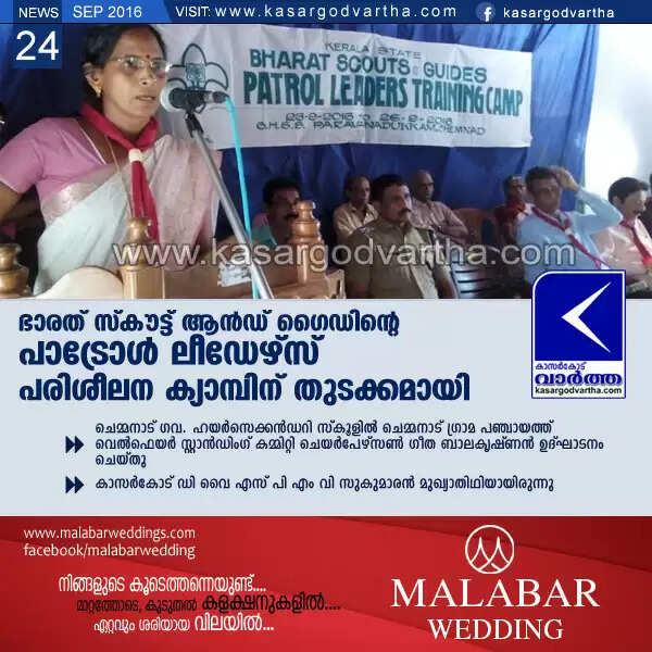 പരവനടുക്കം: (www.kasargodvartha.com 24/09/2014) ഭാരത് സ്‌കൗട്ട് ആന്‍ഡ് ഗൈഡ് കാസര്‍കോട് ലോക്കല്‍ അസോസിയേഷന്റെ നാല് ദിവസത്തെ പാട്രോള്‍ ലീഡേഴ്‌സ് പരിശീലന ക്യാമ്പിന് ചെമ്മനാട് ഗവ. ഹയര്‍സെക്കന്‍ഡറി സ്‌കൂളില്‍ തുടക്കമായി. വെള്ളിയാഴ്ച ഉച്ചയ്ക്ക് തുടങ്ങിയ ക്യാമ്പ് തിങ്കളാഴ്ച സമാപിക്കും.