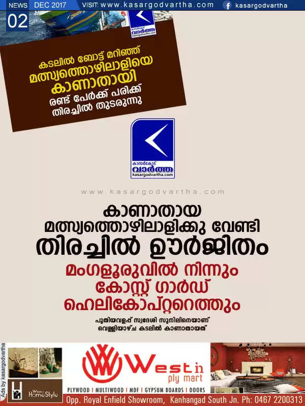 Keywords: Kasaragod, Kerala, News, Missing, Boat accident, Fisherman, Police, Search tighten for missing fisherman.