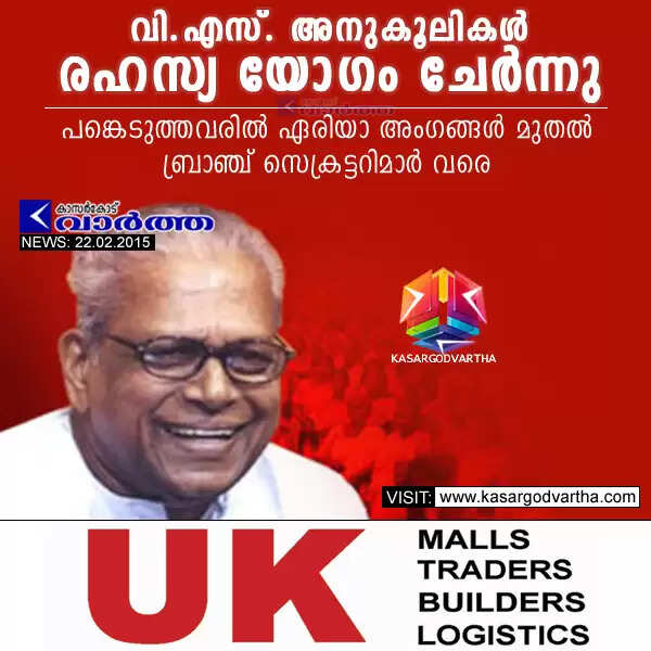 നീലേശ്വരം: (www.kasargodvartha.com 22/02/2015) സി.പി.എം സംസ്ഥാന സമ്മേളനത്തില്‍ വി.എസിനെ പ്രതിക്കൂട്ടില്‍ നിര്‍ത്തിക്കൊണ്ട് ഔദ്യോഗിക വിഭാഗം ശക്തമായ വിമര്‍ശനം ഉന്നയിച്ച് ഒറ്റപ്പെടുത്തിയതിനെ തുടര്‍ന്ന് സംസ്ഥാന സമ്മേളനത്തില്‍ നിന്നും ഇറങ്ങിപ്പോയ വി.എസ് അച്യുതാനന്ദന്റെ ജില്ലയിലെ അനുകൂലികള്‍ പാര്‍ട്ടി ശക്തി കേന്ദ്രങ്ങളിലെല്ലാം രഹസ്യ യോഗം ചേര്‍ന്നു.