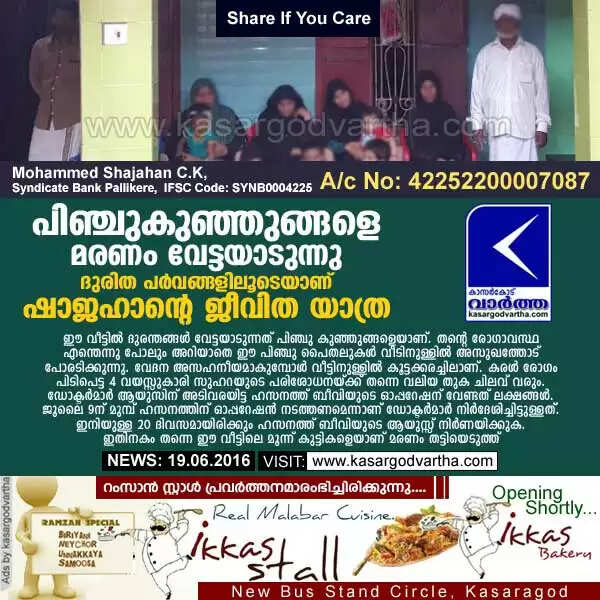 ഷാജഹാന്റെ രണ്ട് പേരമക്കളെയാണ് ഇപ്പോള് ഗുരുതരമായ അസുഖം പിടികൂടിയിരിക്കുന്നത്. ഒരാള്ക്ക് ജൂലൈ ഒമ്പതിനാണ് ശസ്ത്രക്രിയ. മറ്റൊരാള്ക്ക് ഇതുവരെ വിദഗ്ധ പരിശോധന നടത്താന് പോലും സാധിച്ചിട്ടില്ല. കുടുംബത്തിലെ എല്ലാ അംഗങ്ങള്ക്കും ഹൃദയ, കരള് പരിശോധന നടത്താനാണ് ഈ കുടുംബത്തിന്റെ ദുരിതം മനസ്സിലാക്കിയ ഡോക്ടര്മാര് പറയുന്നത്. എന്നാല് ആ ഭാരിച്ച ചിലവൊന്നും ഈ കുടുംബത്തിന് താങ്ങാന് പറ്റുന്നതല്ല.