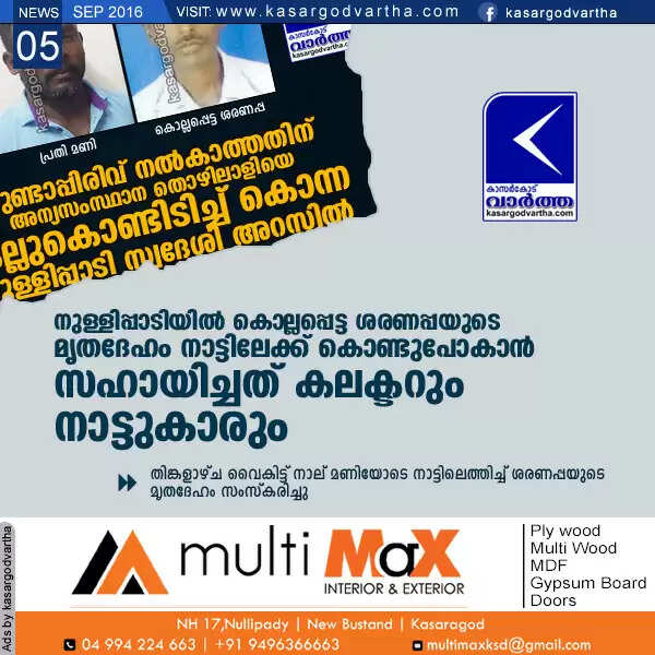 കാസര്‍കോട്: (www.kasargodvartha.com 05.09.2016) ഗുണ്ടാപ്പിരിവ് നല്‍കാത്തതിന് കല്ലുകൊണ്ടിടിച്ച് കൊലപ്പെടുത്തിയ കര്‍ണാടക കൊപ്പല്‍ മലകസമുദ്രയിലെ ശരണപ്പ (34)യുടെ മൃതദേഹം നാട്ടിലെത്തിക്കാന്‍ കലക്ടറുടെയും നാട്ടുകാരുടെയും സഹായം. പരിയാരം മെഡിക്കല്‍ കോളജില്‍ നിന്നും പോസ്റ്റുമോര്‍ട്ടം കഴിഞ്ഞ് ഞായറാഴ്ച രാത്രി ഏഴ് മണിയോടെ കാസര്‍കോട് പോലീസ് സ്‌റ്റേഷനിലെത്തിച്ച മൃതദേഹം നാട്ടിലെത്തിക്കാന്‍ പണമില്ലാത്തതിനാല്‍ ബന്ധുക്കളും കൂടെയുള്ളവരും വിഷമിച്ചു.