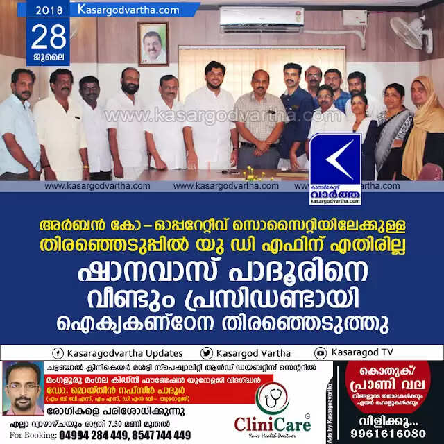 അര്ബന് കോ-ഓപ്പറേറ്റീവ് സൊസൈറ്റിയിലേക്കുള്ള തിരഞ്ഞെടുപ്പില് യു ഡി എഫിന് എതിരില്ല; ഷാനവാസ് പാദൂരിനെ വീണ്ടും പ്രസിഡണ്ടായി ഐക്യകണ്ഠേന തിരഞ്ഞെടുത്തു