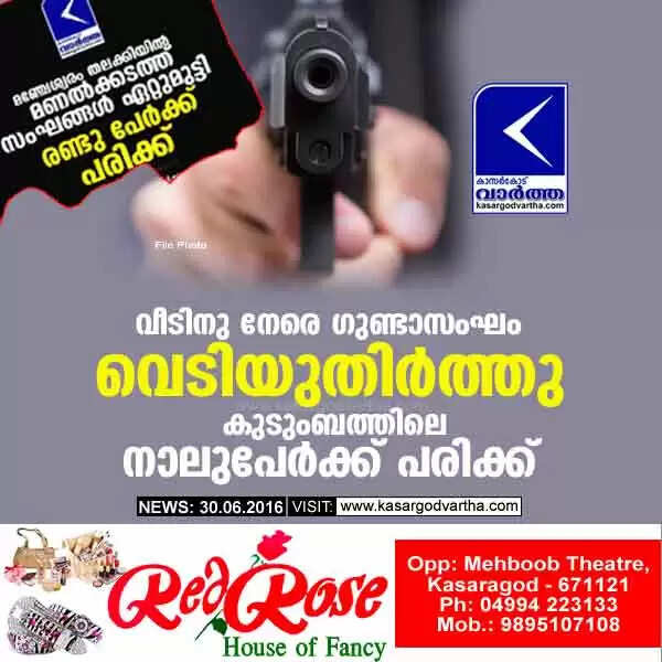 മഞ്ചേശ്വരം: (www.kasargodvartha.com 30.06.2016) മഞ്ചേശ്വരത്ത് വീടിനുനേരെ ഗുണ്ടാസംഘത്തിന്റെ വെടിവെപ്പ്. ലോറി ക്ലീനറായ മജീദിന്റെ വീടിനു നേരയാണ് വ്യാഴാഴ്ച പുലര്‍ച്ചെ മൂന്നുമണിയോടെ വെടിവെപ്പുണ്ടായത്. സ്ത്രീയുള്‍പ്പടെ നാല് പേര്‍ക്ക് വെടിവെപ്പില്‍ പരിക്കേറ്റു.