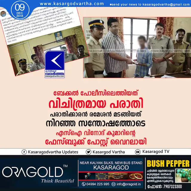 ബേക്കല് പോലീസിലെത്തിയത് വിചിത്രമായ പരാതി; പരാതിക്കാരന് രമേശന് മടങ്ങിയത് നിറഞ്ഞ സന്തോഷത്തോടെ; എസ്ഐ വിനോദ് കുമാറിന്റെ ഫേസ്ബുക്ക് പോസ്റ്റ് വൈറലായി