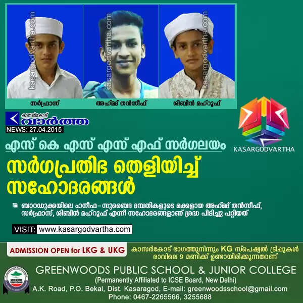 ബദിയടുക്ക: (www.kasargodvartha.com 27/04/2015) ബദിയടുക്ക മേഖല സംഘടിപ്പിച്ച എസ് കെ എസ് എസ് എഫ് സര്ഗലയത്തില് സര്ഗപ്രതിഭയറിയിച്ച് സഹോദരങ്ങള്. അഹ്മദ് തന്സീഫ്, സര്ഫ്രാസ്, ശിബിന് മഹ്റൂഫ് എന്നീ സഹോദരങ്ങളാണ് ശ്രദ്ധേയരായി മാറിയത്. ബാറഡുക്കയിലെ ഹനീഫ-സുബൈദ ദമ്പതികളുടെ മക്കളാണ് ഇവര്.