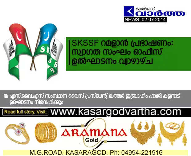 കാസര്കോട്: (www.kasargodvartha.com 02.07.2014) എസ്.കെ.എസ്.എസ്.എഫ് കാസര്കോട് സംഘടിപ്പിക്കുന്ന റമളാന് പ്രഭാഷണത്തിന്റെ സ്വാഗത സംഘം ഓഫീസ് ഉദ്ഘാടനം വ്യാഴാഴ്ച ഉച്ചയ്ക്ക് രണ്ട് മണിക്ക് വിദ്യാനഗറില് നടക്കും.