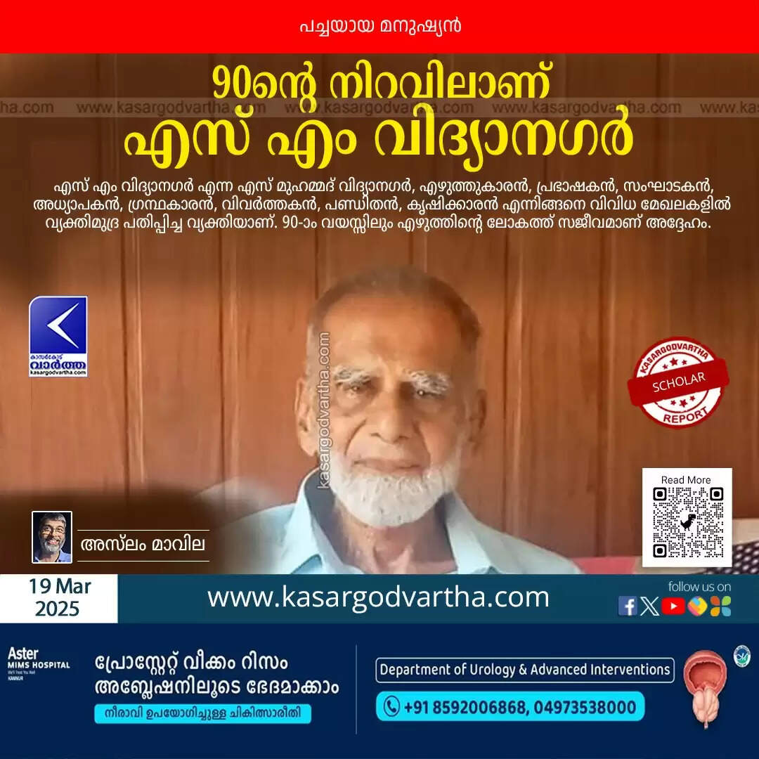(KasargodVartha) എഴുത്തുകാരൻ, പ്രഭാഷകൻ, സംഘാടകൻ, അധ്യാപകൻ, ഗ്രന്ഥകാരൻ, വിവർത്തകൻ, പണ്ഡിതൻ, കൃഷിക്കാരൻ.... വേറിട്ടൊരു ജീവിതം. പച്ചയായ മനുഷ്യൻ. എളിമയുടെ പര്യായം. അറിവിന് പിന്നാലെ യാത്ര. അറിവില്ലായ്മക്കെതിരെ സന്ധിയില്ലാത്ത പോരാളി. എസ് മുഹമ്മദ് വിദ്യാനഗർ എന്ന എസ് എം വിദ്യാനഗർ ഇതൊക്കെതന്നെയാണ്. അൽബുഷ്റ അറബിക് മാസികയിലേക്ക് ലേഖനം അയക്കാനുള്ള തിരക്കിലാണ് അദ്ദേഹം, ഒരു ശിഷ്യൻ കൂടെയുണ്ട്. വിശ്രമജീവിതത്തിലും എഴുത്തിൻ്റെ ലോകത്ത് എസ് എം വിദ്യാനഗർ ഉണ്ട്, തൻ്റെ സാന്നിധ്യം അറിയിച്ചു കൊണ്ട്.