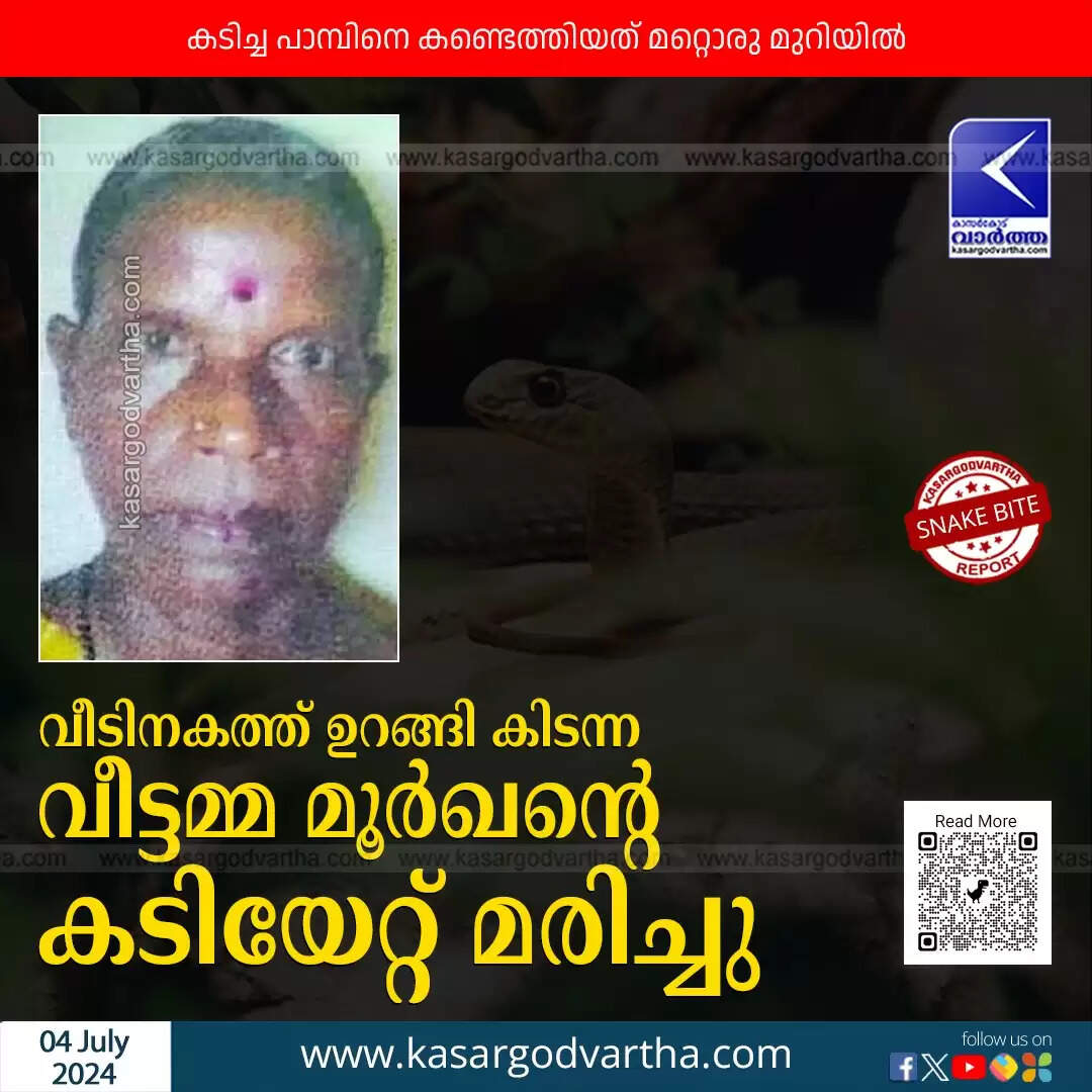 ചോമുവിനെ കടിച്ച പാമ്പിനെ പാമ്പുപിടിത്ത വിദഗ്ധരെത്തി പടികൂടി വനം വകുപ്പിന് കൈമാറി. ഭര്ത്താവ് പരേതനായ മാങ്കു. മകള്: അക്കു. മരുമകന്: അണ്ണു. സഹോദരങ്ങള്: മത്താടി, ഐത്ത.