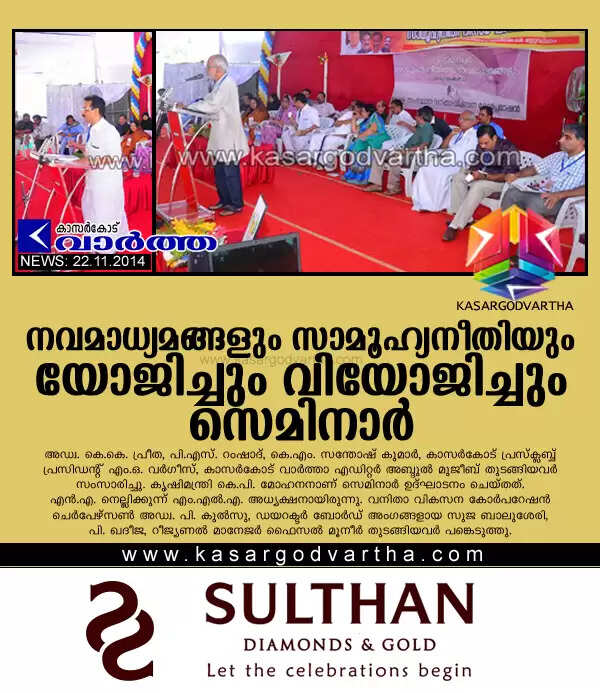 കാസര്കോട്: (www.kasargodvartha.com 22.11.2014) സാമൂഹ്യനീതി യാഥാര്ത്ഥ്യമാക്കുന്നതില് നവമാധ്യമങ്ങള്ക്ക് വഹിക്കാനുള്ള പങ്കിനെകുറിച്ച് യോജിച്ചും വിയോജിച്ചും മാധ്യമസെമിനാര്. സാമൂഹ്യനീതി ദിനാഘോഷത്തിന്റെ ഭാഗമായി മുന്സിപ്പല് സ്റ്റേഡിയത്തിലാണ് മാധ്യമസെമിനാര് നടന്നത്.