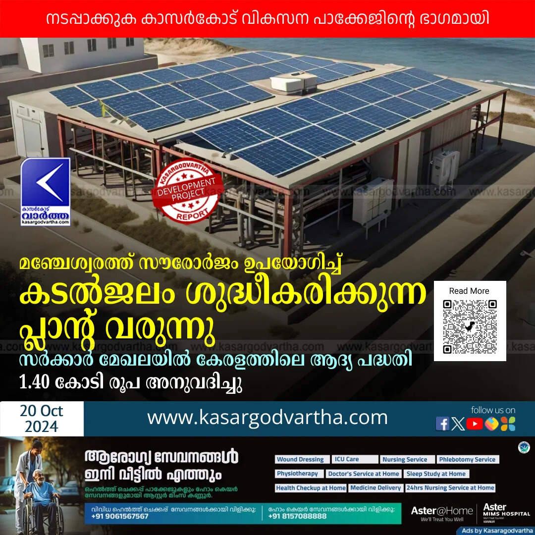 Approval | മഞ്ചേശ്വരത്ത് സൗരോർജം ഉപയോഗിച്ച് കടൽജലം ശുദ്ധീകരിക്കുന്ന പ്ലാന്റ് വരുന്നു; സർക്കാർ മേഖലയിൽ കേരളത്തിലെ ആദ്യ പദ്ധതി; 1.40 കോടി രൂപ അനുവദിച്ചു