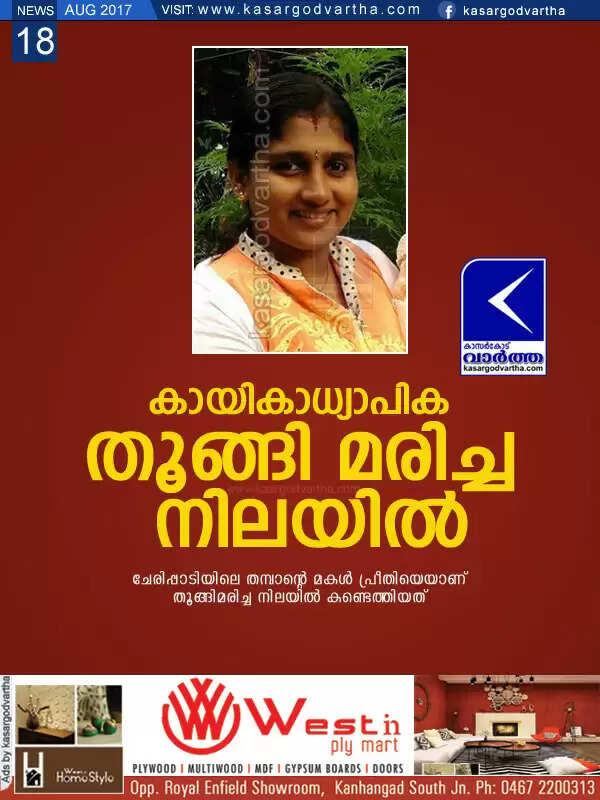 ബേഡകം: (www.kasargodvartha.com 18.08.2017) മുന്‍ ദേശീയ കബഡി താരവും കായികാധ്യാപികയുമായ യുവതിയെ വീട്ടില്‍ തൂങ്ങിമരിച്ച നിലയില്‍ കണ്ടെത്തി. ചേരിപ്പാടിയിലെ തമ്പാന്റെ മകള്‍ പ്രീതി (26)യെയാണ് വെള്ളിയാഴ്ച ഉച്ചയോടെ വീട്ടിലെ കോവണിയില്‍ തൂങ്ങിമരിച്ച നിലയില്‍ കണ്ടെത്തിയത്.