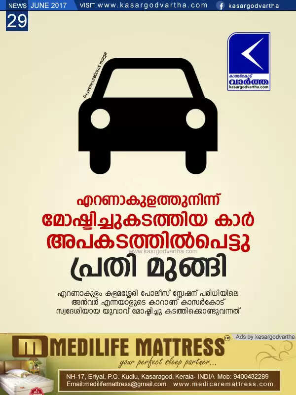 Keywords:  Kasaragod, Kerala, Kumbala, news, Ernakulam, Accident, Car, stolen vehicle met accident, robber abscond