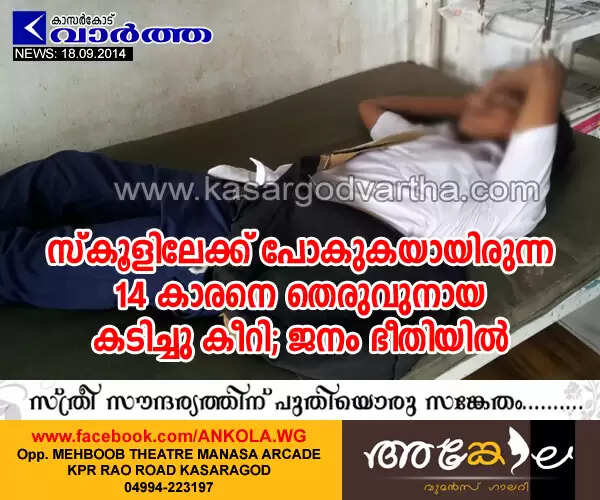 കാസര്‍കോട്:(www.kasargodvartha.com 18.09.2014) സ്‌ക്കൂളിലേക്ക് പോകുകയായിരുന്ന 14 കാരനെ തെരുവുനായ കടിച്ചു കീറി. ബുധനാഴ്ച രാവിലെ ഒമ്പത് മണിയോടെ ചട്ടഞ്ചാല്‍ ടൗണിലാണ് സംഭവം. ചട്ടഞ്ചാലിലെ പുഷ്‌ക്കരന്റെ മകനും ചട്ടഞ്ചാല്‍ ഹയര്‍സെക്കണ്ടറി സ്‌ക്കൂളിലെ ഒമ്പതാം ക്ലാസ് വിദ്യാര്‍ത്ഥിയുമായ കെ.പ്രദീപിനെ(14)യാണ് തെരുവുനായ കടിച്ചു കീറിയത്.