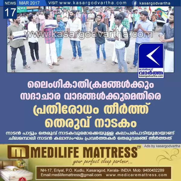 കാസര്‍കോട്: (www.kasargodvartha.com 17/03/2017) മലയാളക്കരയില്‍ കൊച്ചു കുട്ടികളടക്കം പീഡനങ്ങള്‍ക്കിരയാവുന്ന ഘട്ടത്തില്‍ പ്രതിരോധത്തിന്റെ നാടകം തീര്‍ത്ത് ചിലമ്പൊലി നാടന്‍ കലാസംഘം പ്രവര്‍ത്തകര്‍. നാടന്‍ പാട്ടും തെരുവ് നാടകവുമൊക്കെയുള്ള കലാപരിപാടിയുമായാണ് ചിലമ്പൊലി തെരുവരങ്ങ് തീര്‍ത്തത്.